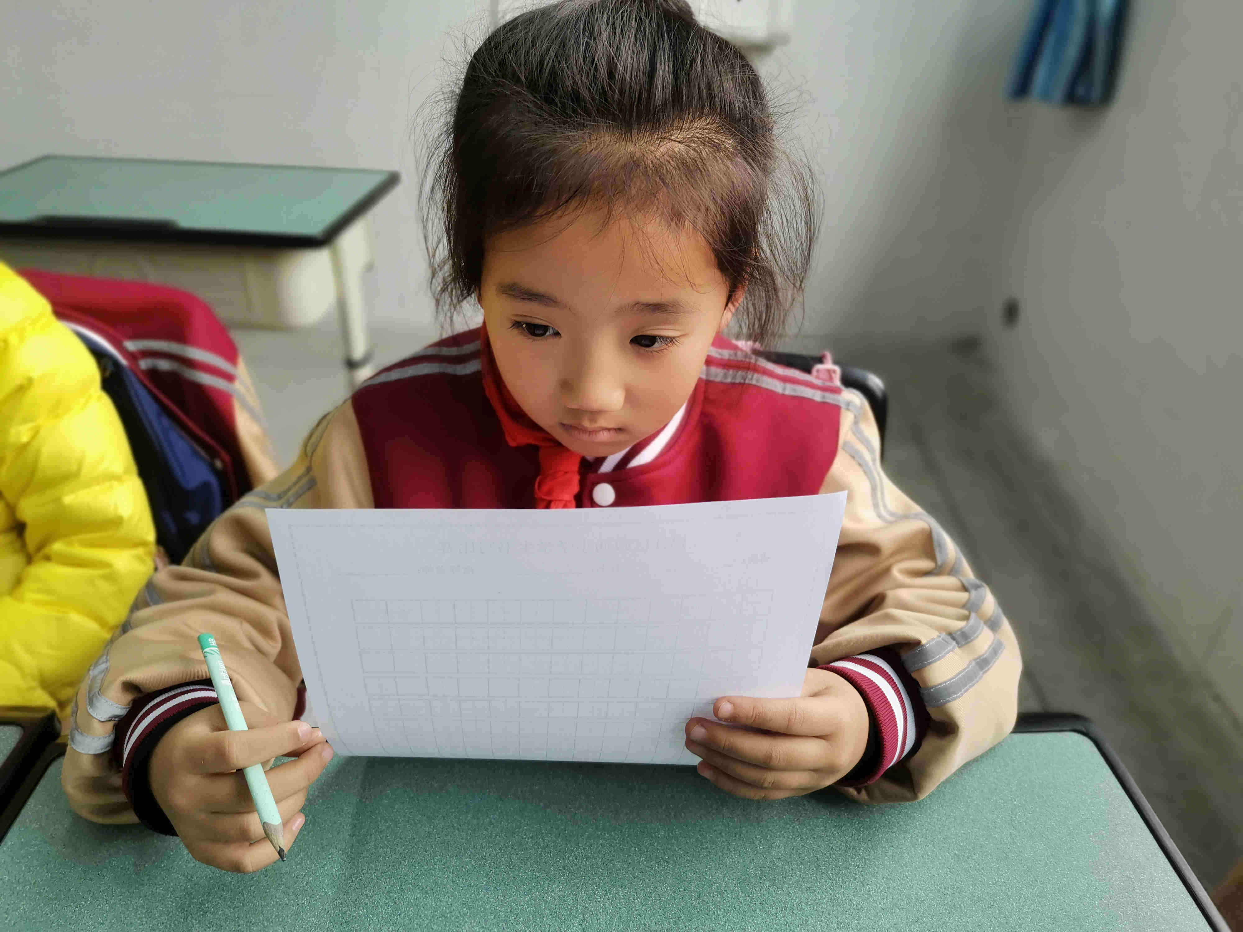 爱好由来下笔难,一字千改始心安。看,小书法家还在仔细检查呢。