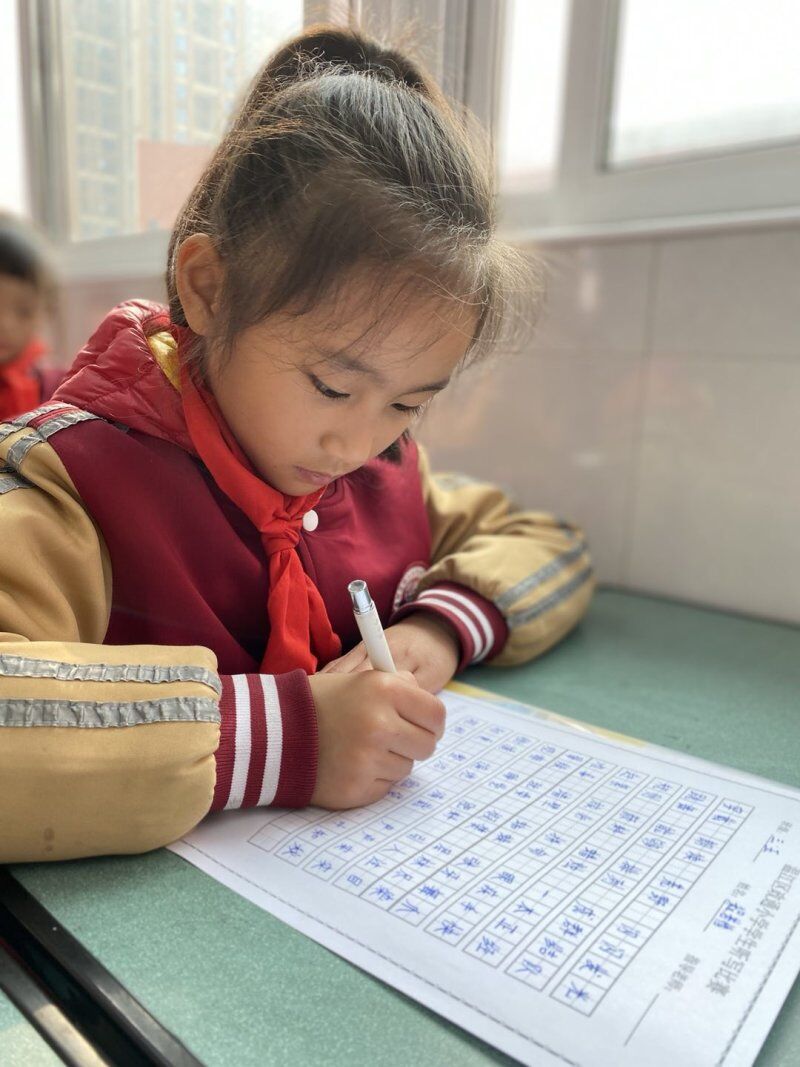 瞧,阳光洒满教室,在孩子们的肩头伫立着,一切都是暖暖的。孩子们聚精会神地书写着老师念的词语,一个个挺直腰背,用钢笔工整的书写,整齐的排列着这些调皮的方块字,这小小书法家的姿势可真标准哪!这可要归功于我们一直铭记于心的书写小秘密——写字做到“三个一”,也是今天评选“最美写字姿势”的法宝哦!