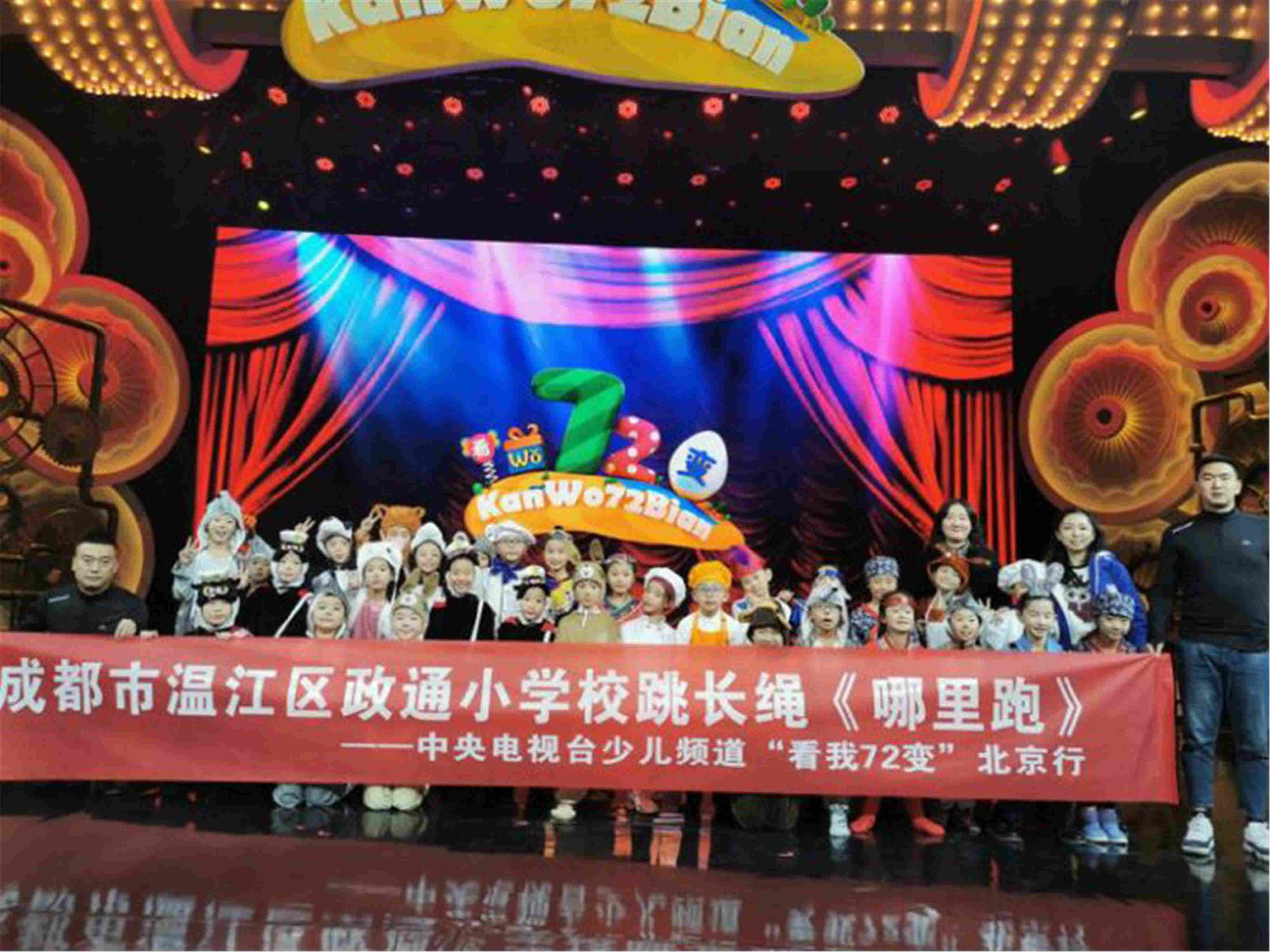 《看我72变》是中央电视台少儿频道全新推出的一档综艺节目,是中国第一档儿童创意表演节目。以创意为内容、以想象力为核心、以肢体和道具为创意手段用诙谐幽默的造型语言讲述儿童对世界的理解。节目准备阶段,在学校领导的大力支持下,由陈雪杨老师牵头,艺体组老师参与,组建起了一支创意团队。历时一个多月,经过反复修改、练习,最终打造出跳长绳节目《哪里跑》。