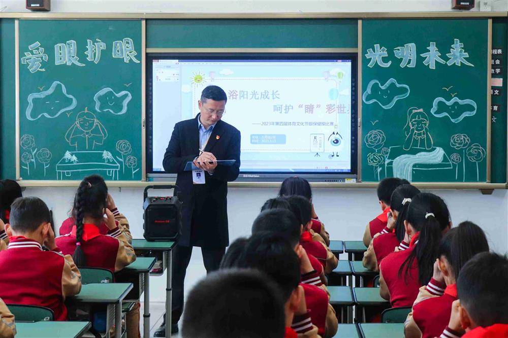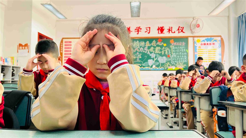 孩子们洗干净小手,整理好着装,端端正正地坐在座位上。按揉攒竹穴、按压睛明穴……随着音乐的节奏和清晰的口令声,眼保健操比赛正式拉开了帷幕。