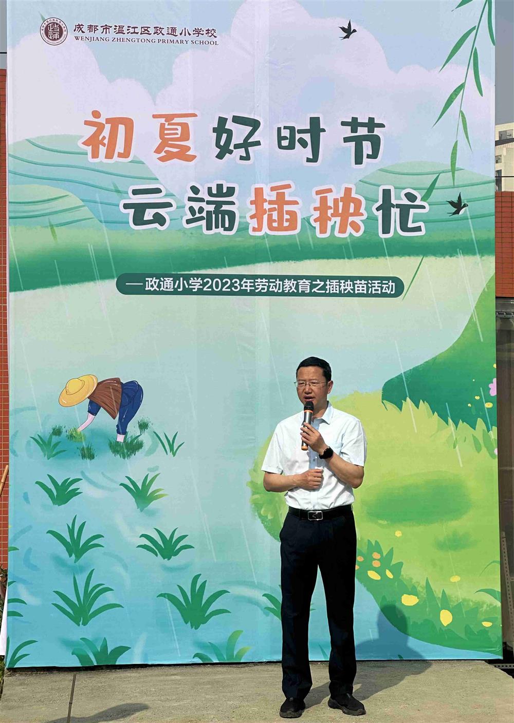 黄金强校长亲切致辞,对孩子们提出了希望:通过这次的插秧活动,学会此项生产劳动技能,体会劳动的艰辛与不易,从而更加珍惜粮食,并且尊重每一位劳动者。