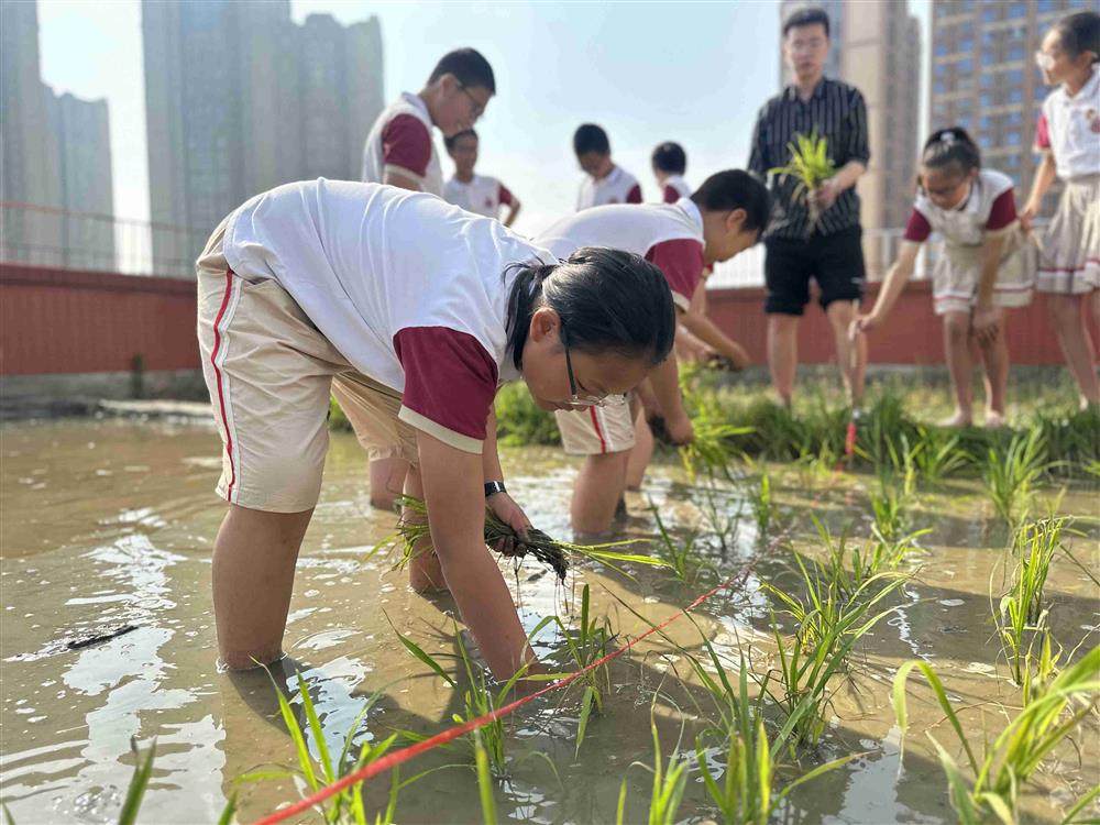 脱掉鞋子、挽起裤腿、光着脚丫……在花开满园的五月时节,政通小学云端农场稻田内,一场别开生面的劳动实践课正式开“讲”。