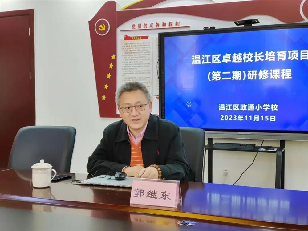 活动伊始,政通小学党支部书记、校长黄金强主持开场。他在热烈欢迎郭继东教授和各位学习成员莅临学校之余,还提出了“教而不研则罔,研而不教则殆”的教育研究思考,让在场学员更加期待接下来郭教授的讲座。